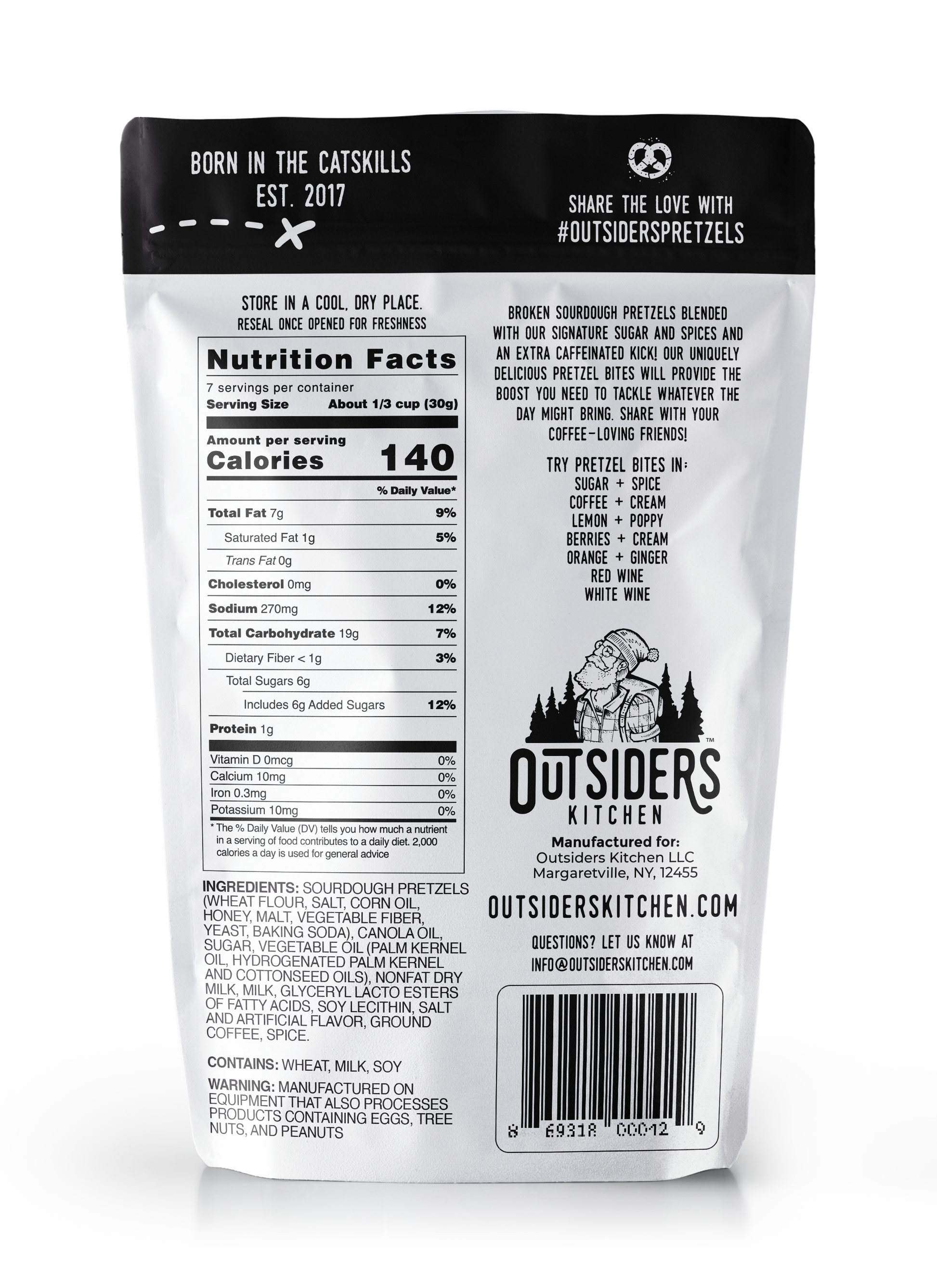 Need a delicious pick-me-up? Outsiders Kitchen Coffee + Cream Pretzel Bites are the ultimate sweet-and-salty snack for coffee lovers who crave bold flavor and satisfying crunch. We start with our signature sourdough pretzels, broken into bite-sized pieces, then infuse them with a rich blend of freshly ground whole bean coffee, smooth cream, and a subtle touch of cinnamon. The result? A perfectly balanced snack that’s energizing, indulgent, and impossible to resist. Whether you're powering through a busy day, unwinding with your favorite book, or just need a little treat between tasks, these bites deliver comfort and caffeine in every handful. Great for on-the-go snacking, midday boosts, or gifting to the coffee enthusiast in your life. They'll fuel your day, the delicious way! Flavor Profile: Bold coffee, sweet cream, warm cinnamon, and a touch of salt